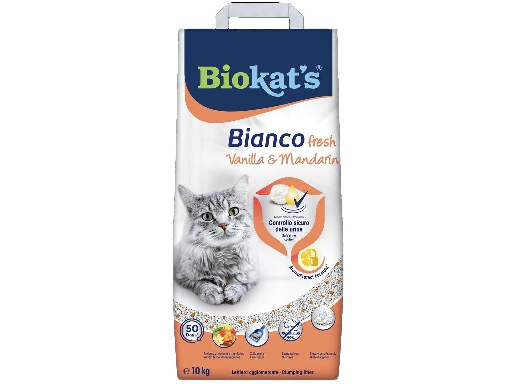 Pokud hledáte prvotřídní podestýlku pro vaši kočku, vyzkoušejte BIOKATS BIANCO FRESH s osvěžující vůní vanilky a mandarinky. Jedná se o hrubozrnnou podestýlku ze 100% přírodního jílu a obsahuje vysoký podíl montmorillonitu, díky kterému je kočkolit obzvláště savý.