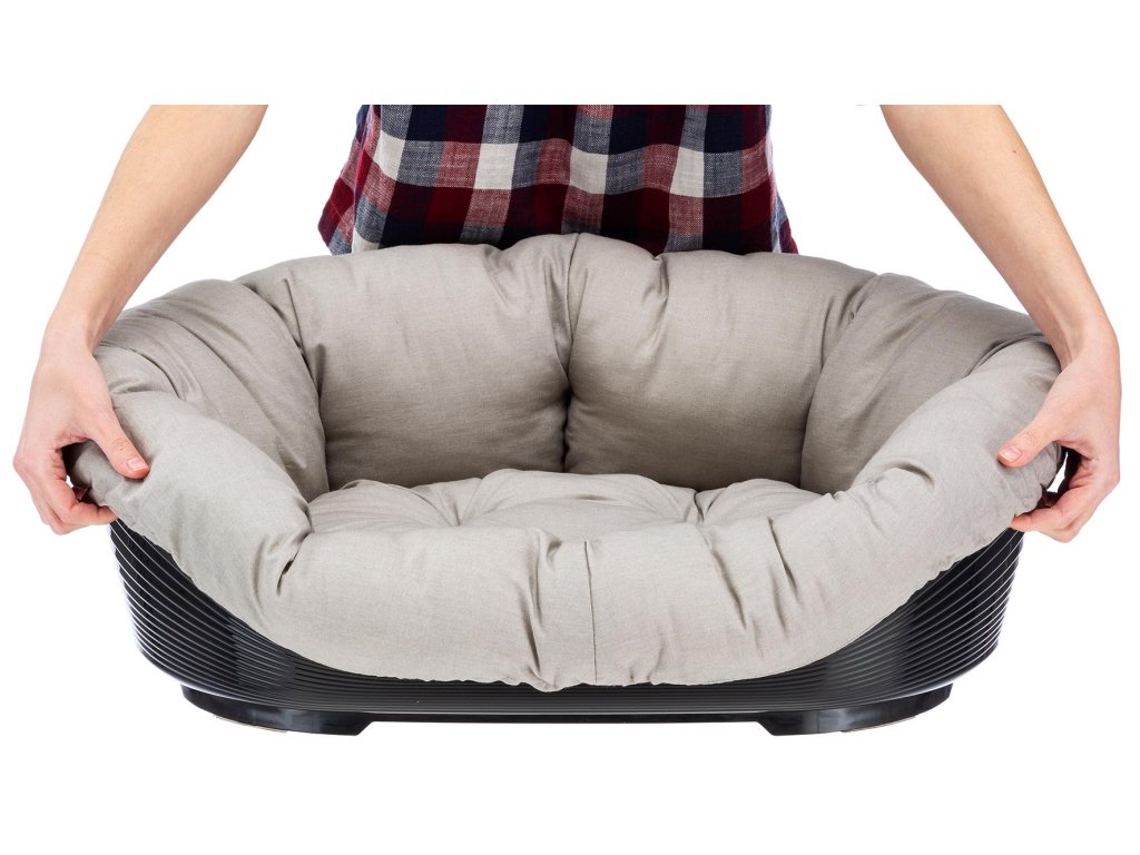 Tento polstrovaný bavlněný polštář je velmi měkký a snadno se umístí do postelí díky speciálně tvarovaným okrajům a popruhu pro připevnění k posteli. Když se zašpiní, lze jej prát v pračce na 30°C. Sofà Cushion je k dispozici v šesti různých velikostech, které lze sladit s plastovými postelemi Siesta Deluxe.