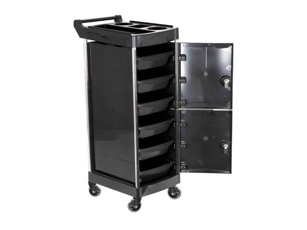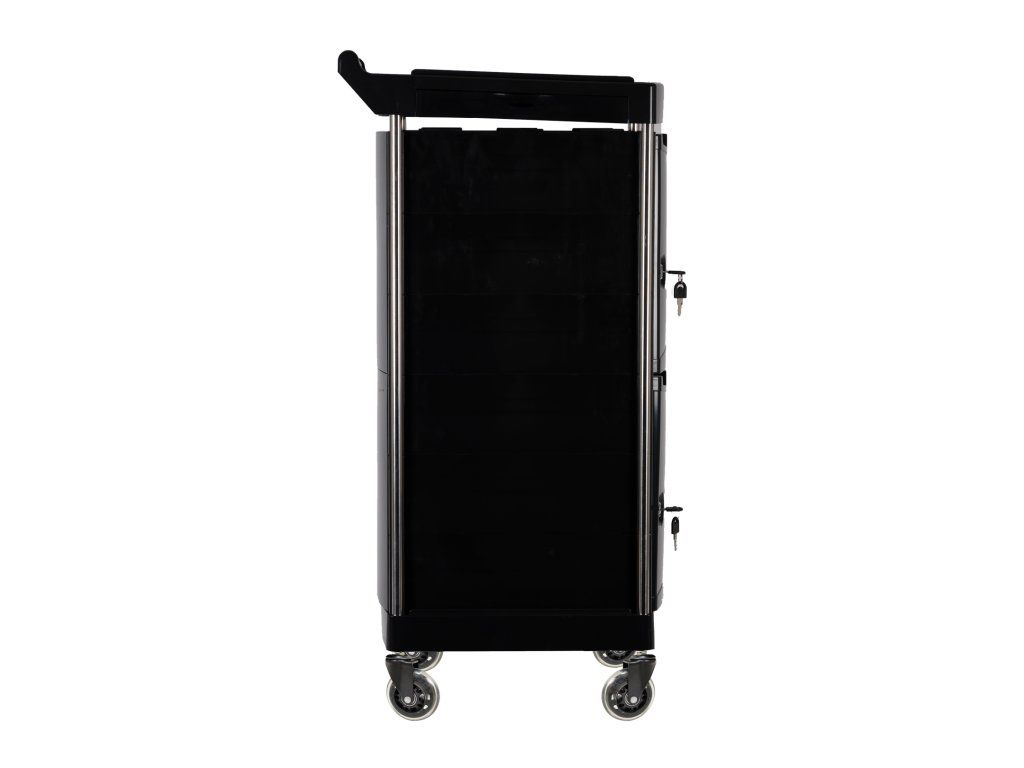 Tento uzamykatelný grooming vozík nabízí dostatek prostoru pro všechny vaše nástroje i kosmetiku. Je vybaven 6 plně výsuvnými šuplíky s protiskluzovým dnem, které zajistí, že vaše vybavení zůstane vždy na svém místě. V horní části se nachází 4 otevřené úložné prostory, ideální pro větší předměty, jako jsou strojky, lahve nebo spreje.