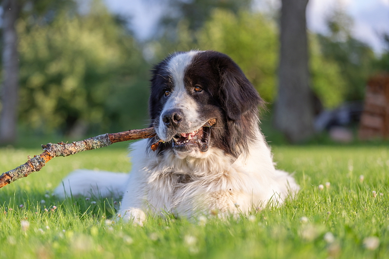 Landseer je vysoké a mohutné plemeno psa s přátelským výrazem v obličeji.