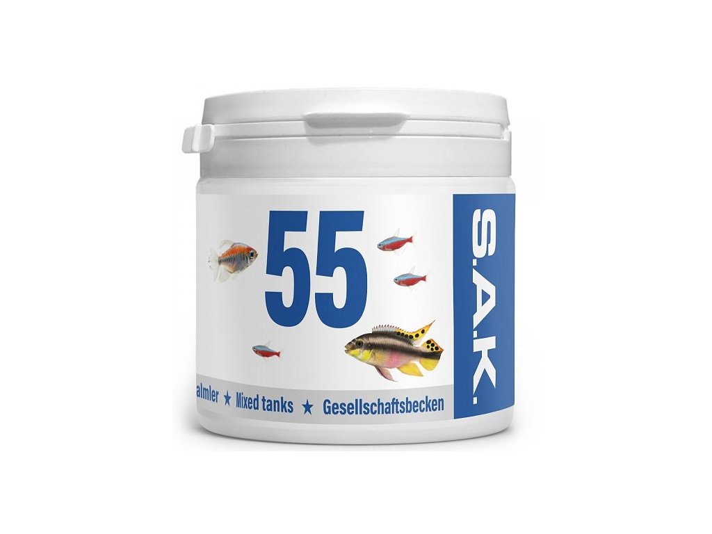 Kompletní krmivo pro akvarijní ryby, základní pro všechny druhy ryb. Vyvážený poměr rostlinné a masové složky zaručuje rychlý růst a zdravý vývoj ryb. Krmivo S.A.K. 55 je obzvlášť vhodné pro tetrovité ryby, např. pro neonky. Krmivo je ve formě granulí.