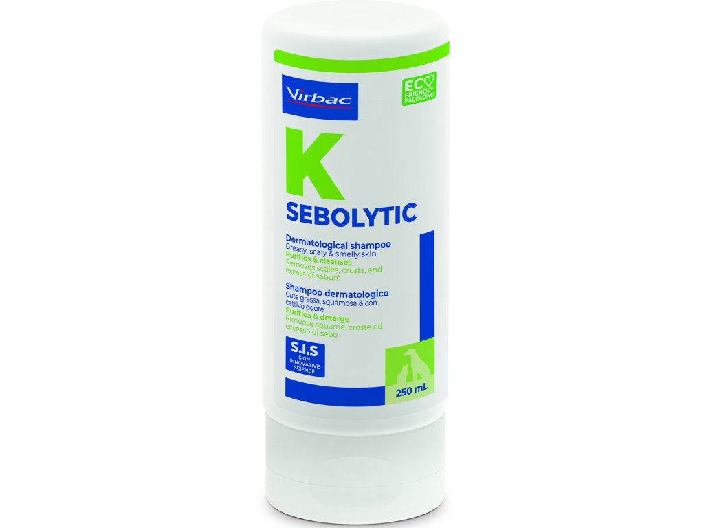 Šampon Sebolytic odstraňuje šupinky, krusty a nadbytek kožního mazu na povrchu kůže psů a koček. Současně neutralizuje nepříjemné pachy. Obsahuje S-I-S technologii. Optimalizovaný dávkovací systém pro snadnou aplikaci.