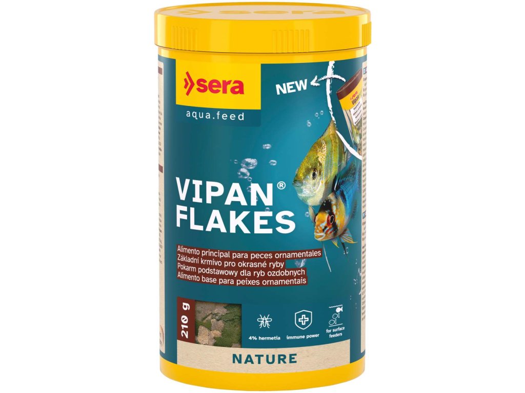 Vipan Flakes je základní krmivo složené z plovoucích vloček bez barviv a konzervačních látek pro všechny okrasné ryby, které se živí na vodní hladině.
