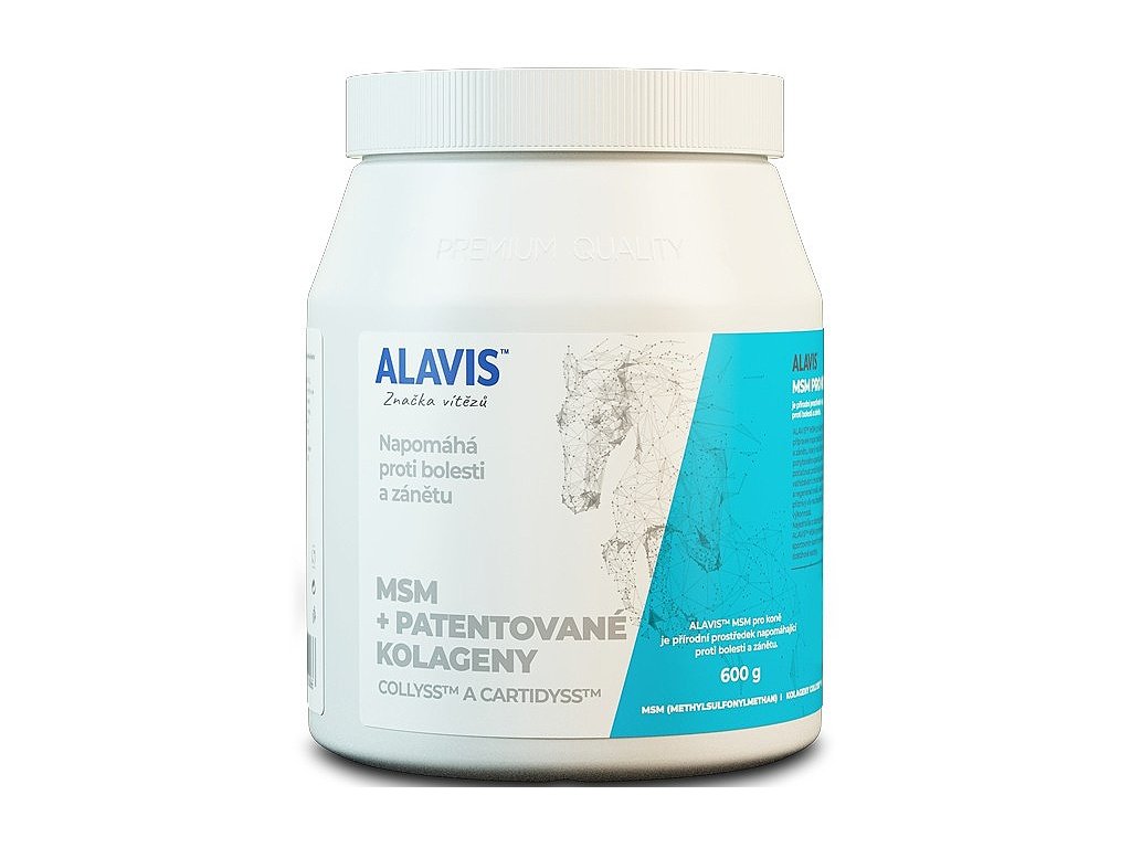 ALAVIS™ MSM pre kone obsahuje ultra čistú formu látky MSM v kombinácii so značkovými kolagénmi COLLYSS™ a CARTIDYSS™.