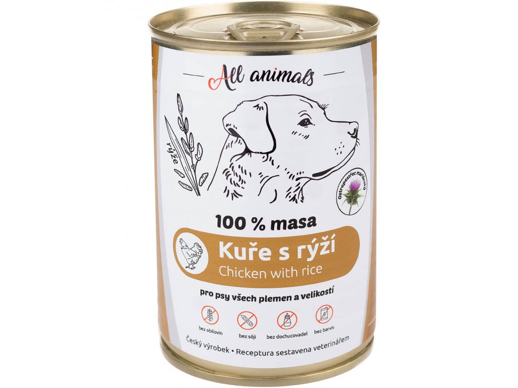 Ryža absorbuje šťavu z mäsa pri sterilizácii a zároveň dodáva psovi potrebné živiny a minerály. Konzerva je bohatá na proteíny a aminokyseliny.