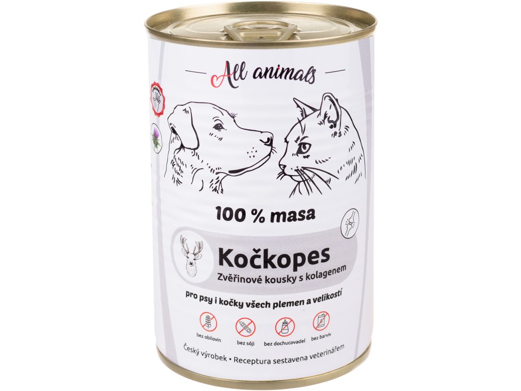 Monoproteínová konzerva All Animals s kolagénom predstavuje superprémiové krmivo pre psov a mačky všetkých veľkostí a plemien. Obsahuje kúsky zveriny doplnené o kolagén, ktorý podporuje funkčnosť pohybového aparátu.