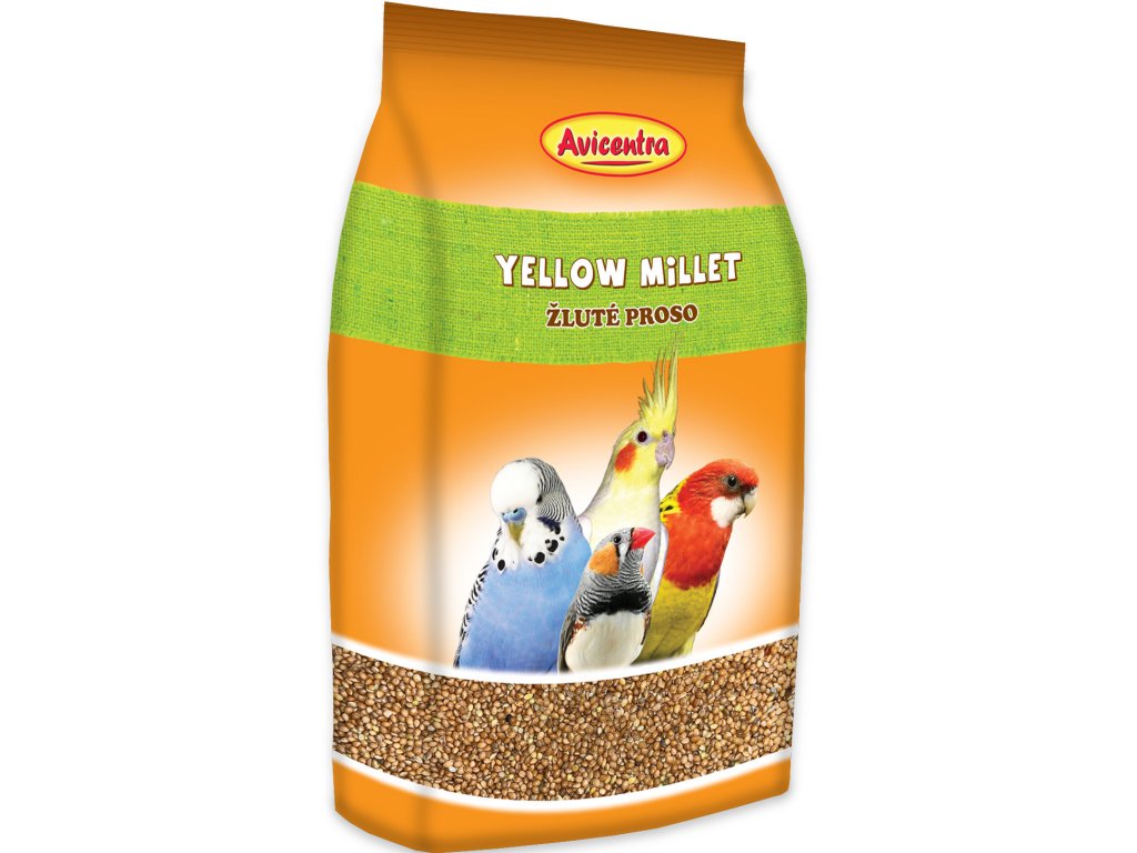 Žlté proso pre exotické vtáctvo, určené ako doplnkové krmivo. Zabezpečte dostatok pitnej vody a krmte podľa potreby vtákov.