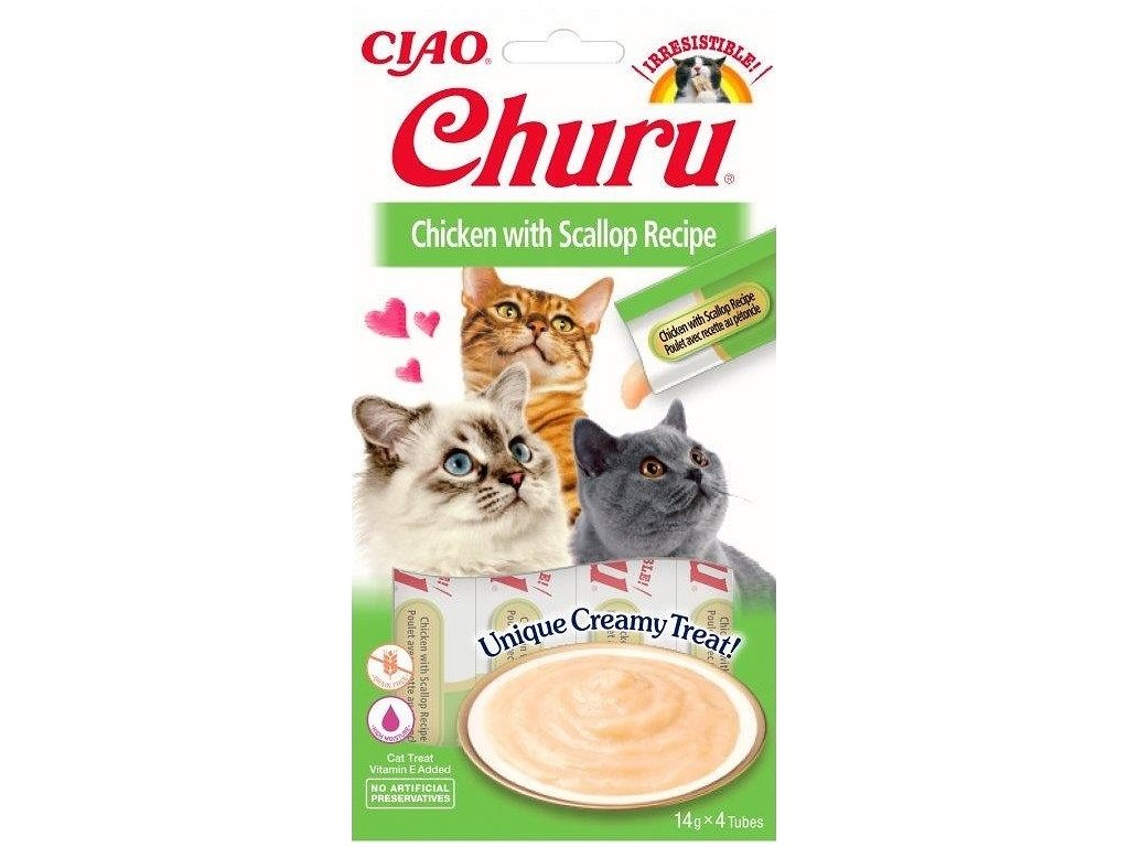 Churu mäsové pyré pre mačky s farmárskym kuracím mäsom a hrebenatkou. Lahodný, prírodný pamlsek krémovej konzistencie bez obilnín. Zdravé maškrtenie s nízkym obsahom kalórií, bez konzervantov, chemických aróm, bez farbív a umelých dochucovadiel. Vďaka možnosti podávať extra chutnú grain free mäsovú pochúťku na spôsob mačacej kapsičky priamo z ruky objavíte nový spôsob odmeňovania.