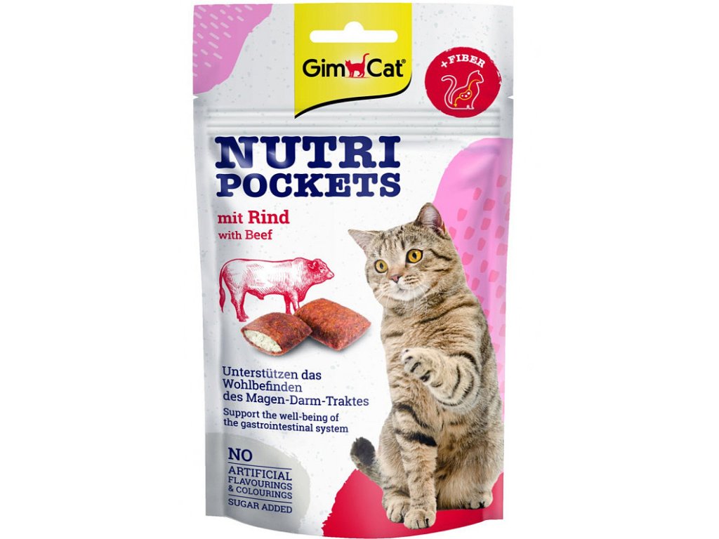 Gimcat Nutri Pocket BEF obsahujú aj vitamíny a živiny dôležité pre pohodu vašej mačky. Vrecká majú nový, krajší obal a vylepšenú receptúru. Nutri pockets sú bez cukru, umelých farbív a konzervačných látok, bez zvýrazňovačov chuti.