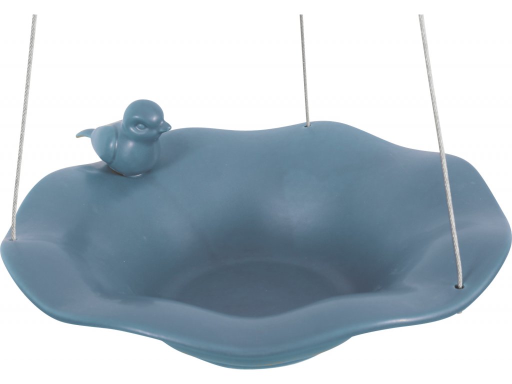 Keramická miska s dekoráciou vtáčika na okraji môže slúžiť ako napájadlo alebo kúpeľ pre vtáky. Keramika je mrazuvzdorná a je opatrená pevnými kovovými lankami na zavesenie. Ø misky 26 cm.
