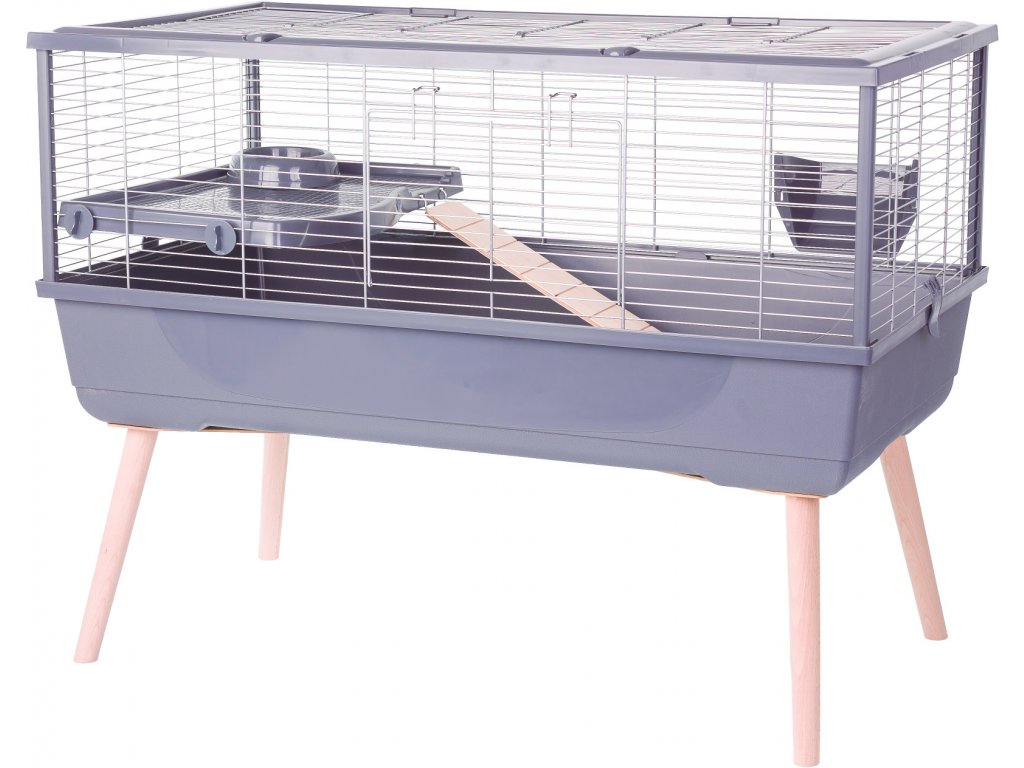 Výbava klietky: 1 plastové poschodie, miska 150 ml, jasličky na seno a 1 drevené schodíky.