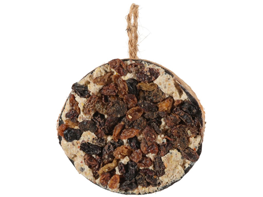 Kokosová škrupina plnená lojom a hrozienkami