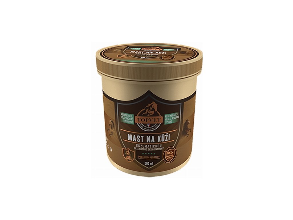 Masť na ekzémovú kožu je určená pre kone s kožnými problémami. Originálna receptúra pokožku vyživuje, hydratuje a chráni pred vonkajším prostredím. Bylinná kompozícia pokožku zjemňuje, znižuje svrbenie a obnovuje elasticitu. Je vhodná na poškriabanú pokožku pre kone s letnou vyrážkou. Masť vykazuje dlhodobý účinok.