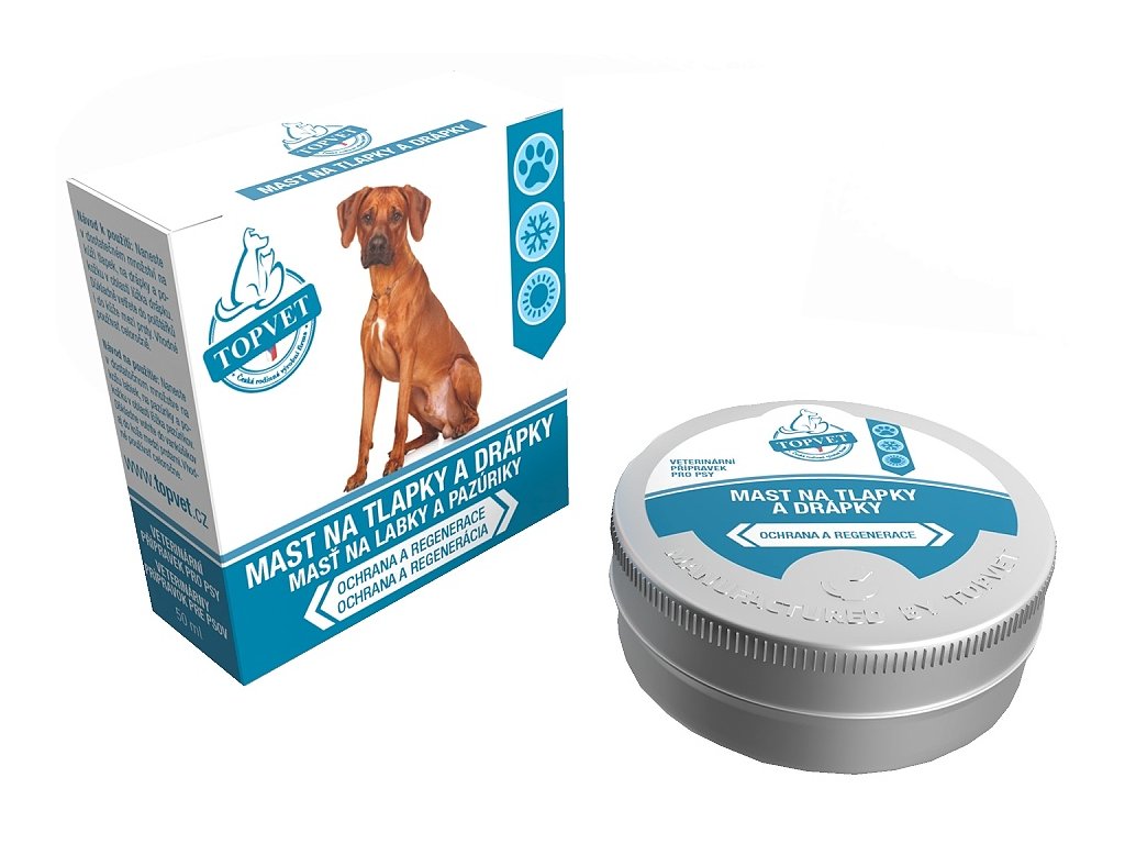 Masť na labky a pazúriky Topvet je luxusný prostriedok na preventívne ošetrenie kože labiek, pazúrikov a ich lôžok. Masť vykazuje miestny ochranný účinok proti nepriaznivým vplyvom prostredia, najmä proti účinkom soli, posypových materiálov, dráždivých látok uvoľňujúcich sa z horúcich asfaltových povrchov chodníkov a vozoviek, nadmernej vlhkosti, prachu, blata, cudzorodých látok a pod. Masť optimálnym spôsobom vyživuje, regeneruje a hojí pazúriky a ich lôžka. Znižuje lámavosť a štiepenie pazúrikov, zvyšuje ich elasticitu a pevnosť.