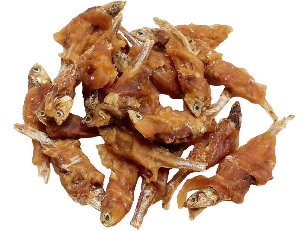 Mäsová pochúťka pre psy a mačky, rybičky obalené kuracím mäsom.