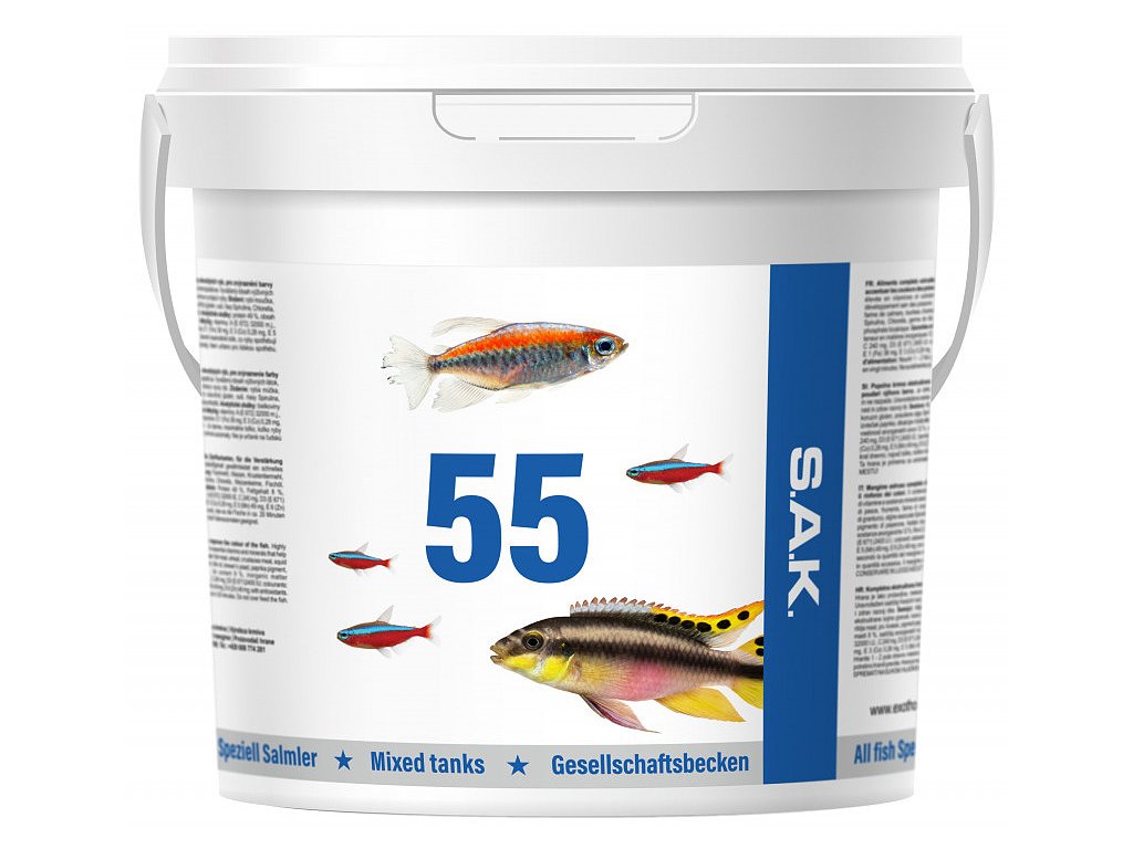 Kompletné krmivo pre akvarijné ryby, základné pre všetky druhy rýb. Vyvážený pomer rastlinnej a mäsovej zložky zaručuje rýchly rast a zdravý vývoj rýb. Krmivo S.A.K. 55 je obzvlášť vhodné pre tetrovité ryby, napr. pre neónky. Krmivo je vo forme granúl.