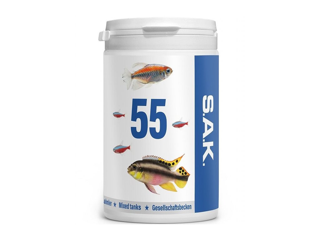Kompletné krmivo pre akvarijné ryby, základné pre všetky druhy rýb. Vyvážený pomer rastlinnej a mäsovej zložky zaručuje rýchly rast a zdravý vývoj rýb. Krmivo S.A.K. 55 je obzvlášť vhodné pre tetrovité ryby, napr. pre neónky. Krmivo je vo forme granúl.