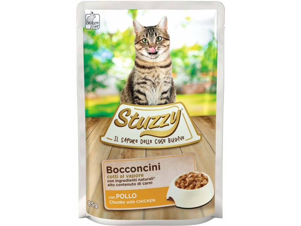 Vlhké krmivo pre mačky s príchuťou kurčaťa je špeciálne pripravované v pare. Talianske kapsičky Stuzzy zachutia aj tej najmaškrtnejšej mačke. Zloženie kapsičky je špeciálne upravené tak, aby spĺňalo výživové požiadavky dospelých mačiek. Kapsičky označené ako Bocconcini obsahujú iba pomaly prírodné suroviny, ktoré sú dusené v pare.