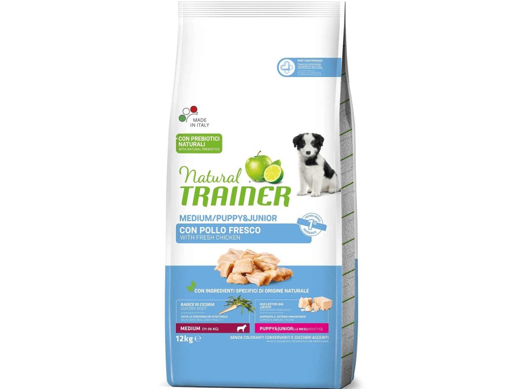TRAINER Natural Medium Puppy&Junior je kompletné a vyvážené krmivo pre šteňatá stredných plemien od 2 do 12 mesiacov ich veku.