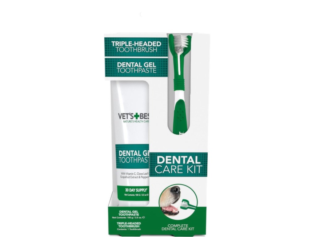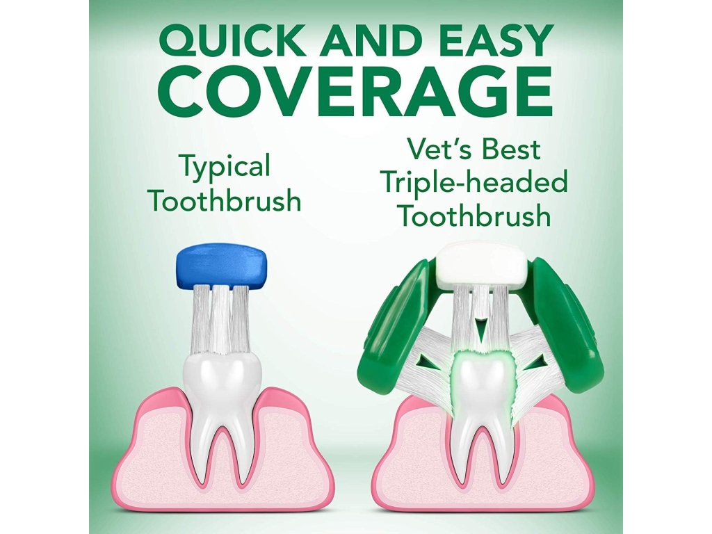 Súčasťou balenia je aj zubná kefka s tromi hlavami, ktoré sa pohodlne prispôsobia tvaru každého zuba a tým efektívne vyčistia celý chrup Vášho psíka.
