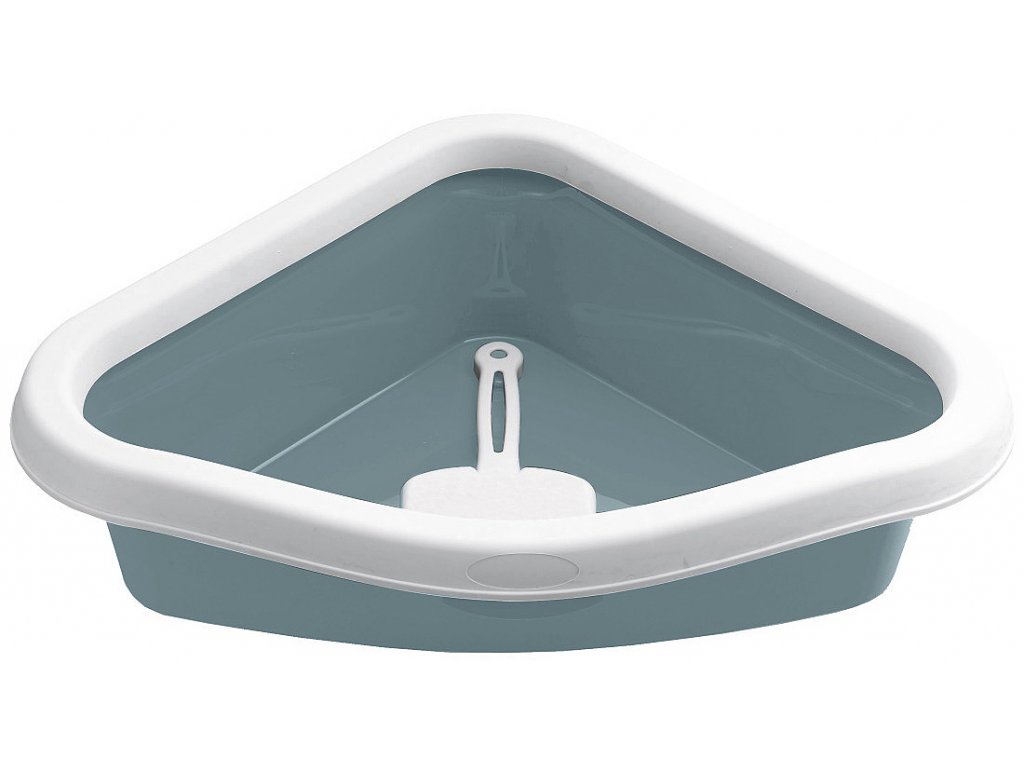 Priestranná otvorená toaleta pre mačky do rohu miestnosti. Zosilnený okraj toalety zabraňuje vypadávaniu podstielky a udržiava tak čistý priestor okolo. Súčasťou balenia je lopatka.
