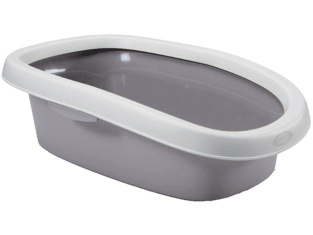 Priestranná otvorená toaleta pre mačky so zosilneným okrajom, ktorý zabraňuje vysypávaniu podstielky.