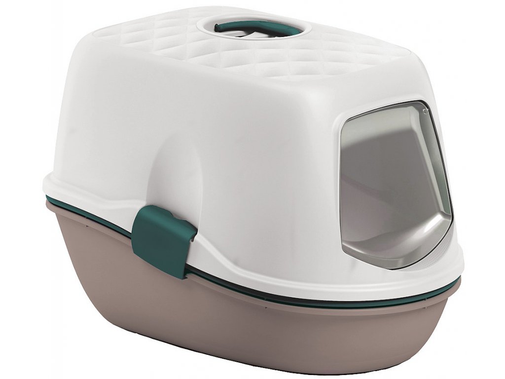 Inovatívna a ekonomická krytá toaleta pre mačky. Toaleta sa skladá z horného krytu s rukoväťou a výklopnými dvierkami a z 2 podnosov a 1 vkladacieho sita.