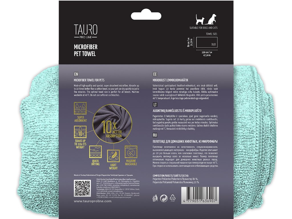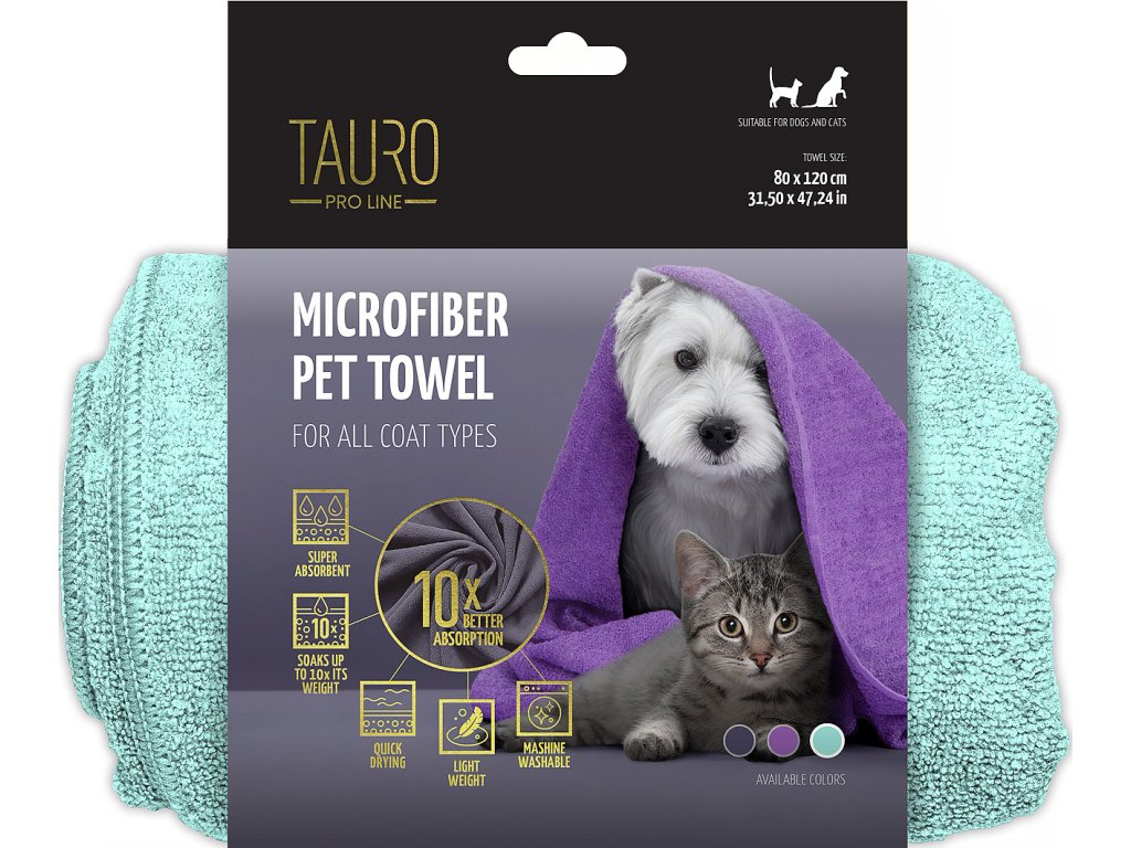 Ručník TAURO PRO LINE je vyroben z inovativního ultrajemného mikrovlákna, které je vhodné pro všechny typy srsti. Díky speciální struktuře materiálu dokáže absorbovat až 10× více vody, než je jeho vlastní hmotnost, což výrazně zkracuje dobu sušení po koupání.