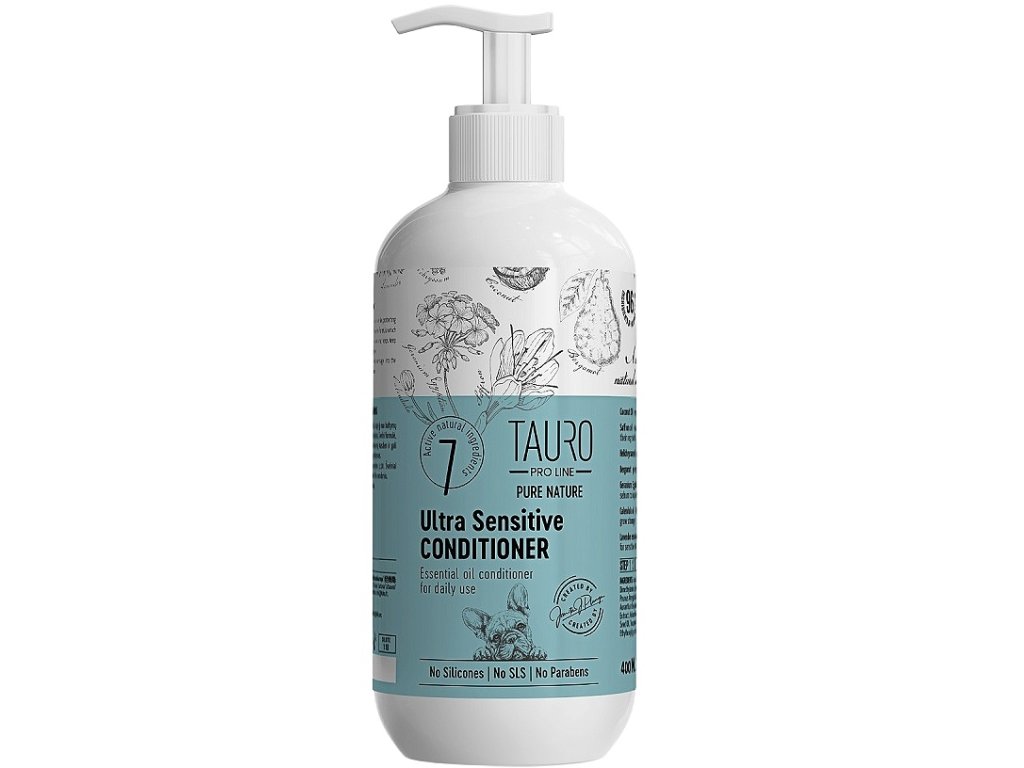 Kondicionér Tauro Pro Line Pure Nature Ultra Sensitive je speciálně vyvinut pro psy a kočky s citlivou nebo podrážděnou pokožkou. Jemné složení s přírodními a esenciálními oleji pomáhá obnovovat srst, chránit ji před ztrátou bílkovin a intenzivně hydratovat slabou, poškozenou nebo procedurami zatíženou srst.