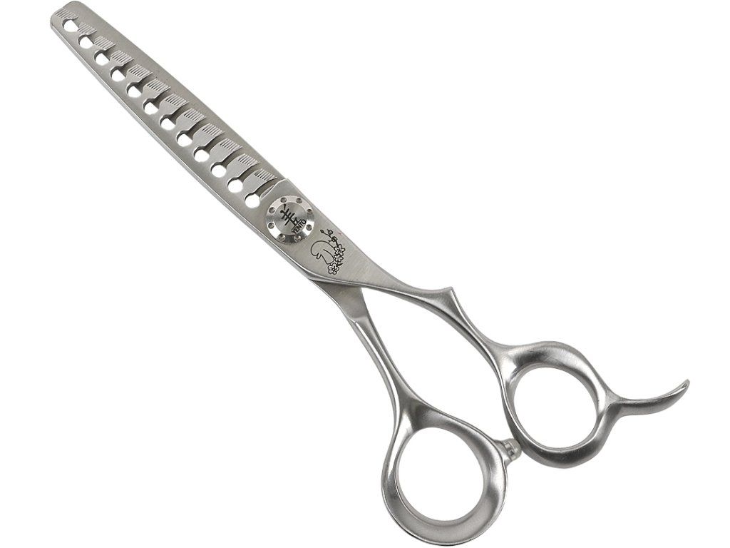 Díky 12 zubům poskytují silnější záběr a umožňují efektivní práci i na husté nebo objemné srsti. Nůžky jsou vyrobeny z kvalitní japonské nerezové oceli 440C, která zajišťuje vysokou ostrost, odolnost a dlouhou životnost. Konkávní (hollow ground) ostří spolu s precizním zpracováním umožňuje hladký a přesný střih bez tahání srsti.