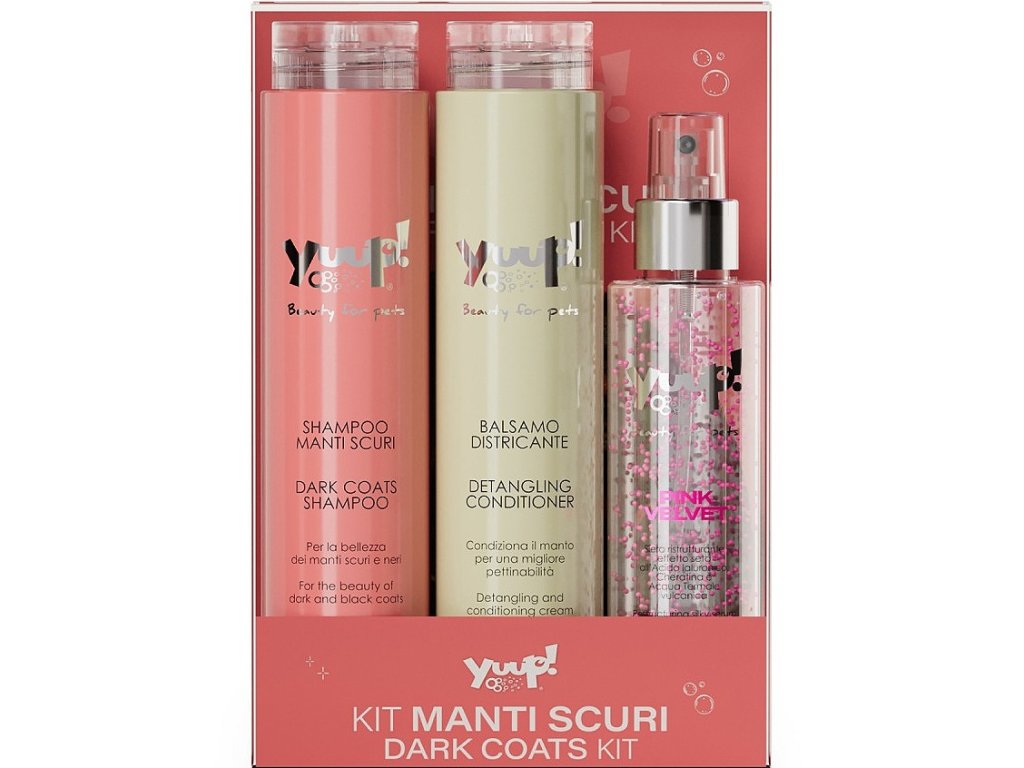 Yuup! Dark Coat Ritual Set je profesionální sada kosmetiky pro psy a kočky, která pomáhá chránit, zvýraznit a oživit barvu tmavé a černé srsti. Díky speciálně vybraným aktivním látkám podporuje intenzitu barvy, lesk a zdravý vzhled srsti, zároveň ji hydratuje a usnadňuje její úpravu.